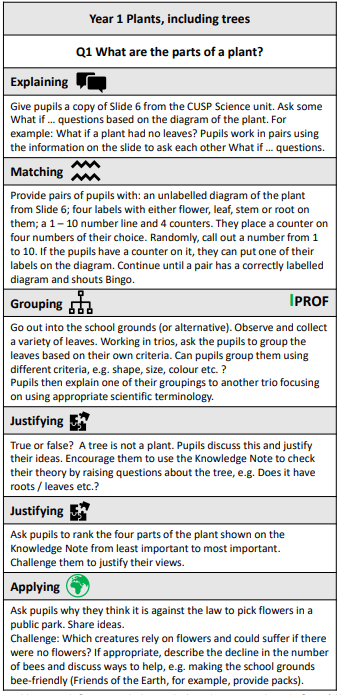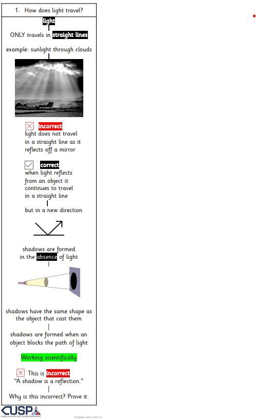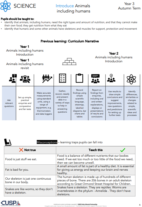 This is the subject knowledge and explicit vocabulary used to learn about the content. Common misconceptions are explicitly revealed as non-examples and positioned against known and accurate content. In CUSP Science, an extensive and connected knowledge base is constructed so that pupils can use these foundations and integrate them with what they already know. Misconceptions are challenged carefully and in the context of substantive and disciplinary knowledge. In CUSP Science, it is recommended that misconceptions are not introduced too early, as pupils need to construct a mental model in which to position that new knowledge.