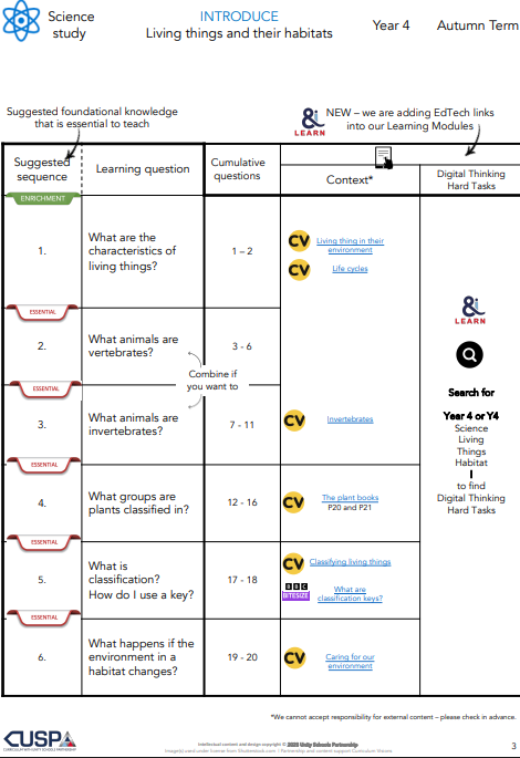 The sequence of learning makes clear essential and desirable knowledge, key questions and task suggestions for each lesson and suggested cumulative quizzing questions.