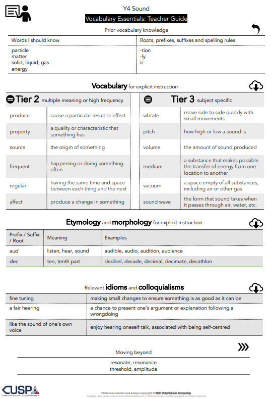 The units are supported by vocabulary modules which provide both resources for teaching and learning vital vocabulary and provide teachers with Tier 2 and 3 vocabulary with the etymology and morphology needed for explicit instruction details relevant idioms and colloquialisms to make this learning explicit.