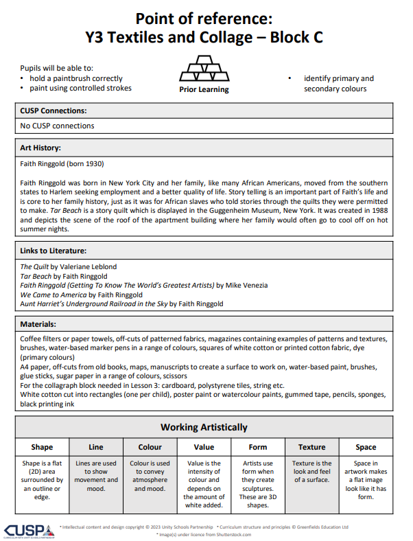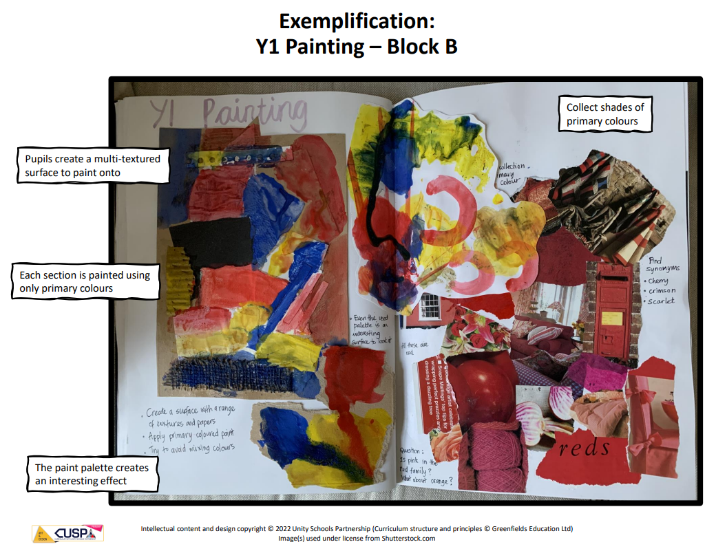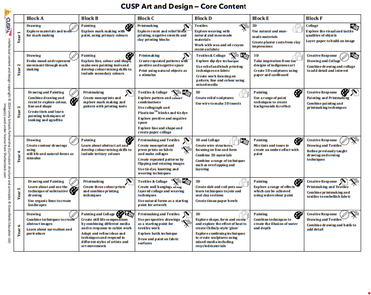 CUSP Art is organised into blocks, each focusing on a specific artistic discipline. Vertical progression is carefully woven throughout the curriculum so that pupils revisit drawing, painting, printmaking, textiles, 3D and collage with increasing challenge and sophistication.