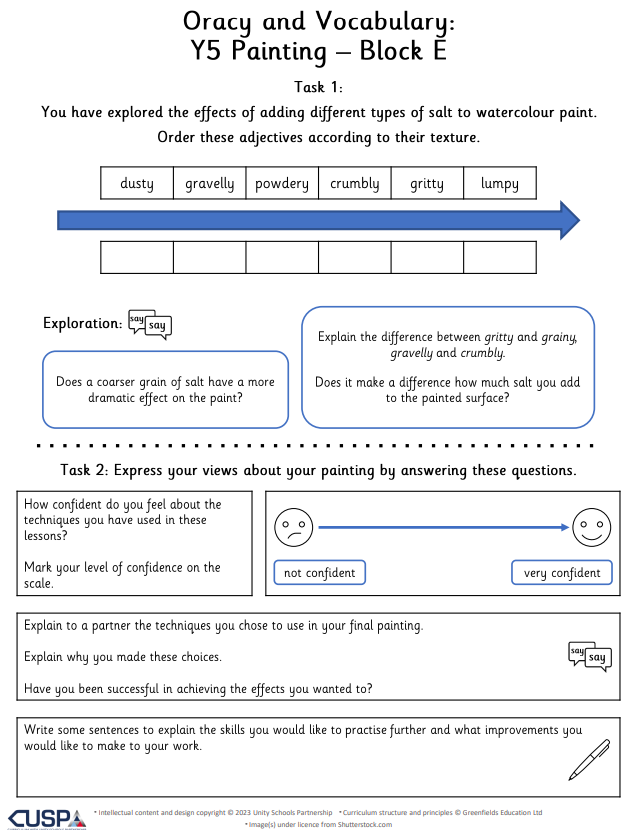 Oracy and vocabulary tasks, which assess pupils’ ability to use artistic language accurately and confidently.