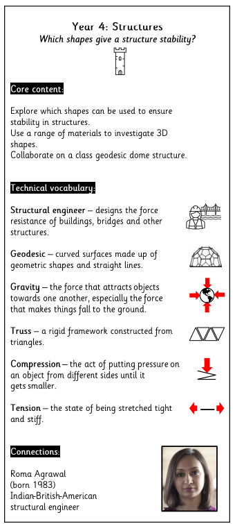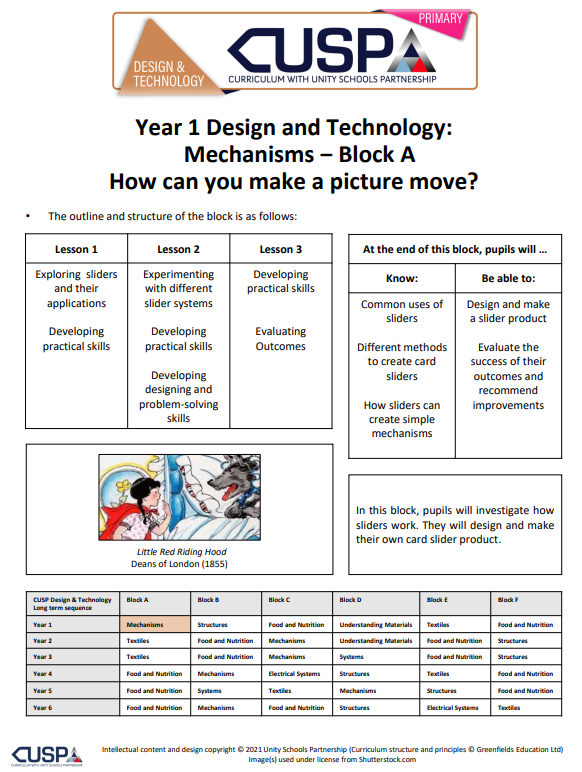 Each block makes expectations explicit. Teachers are clear about what pupils should know and be able to do by the end of the unit — for example, selecting appropriate materials, constructing stable structures, applying mechanisms accurately or evaluating products against design criteria.